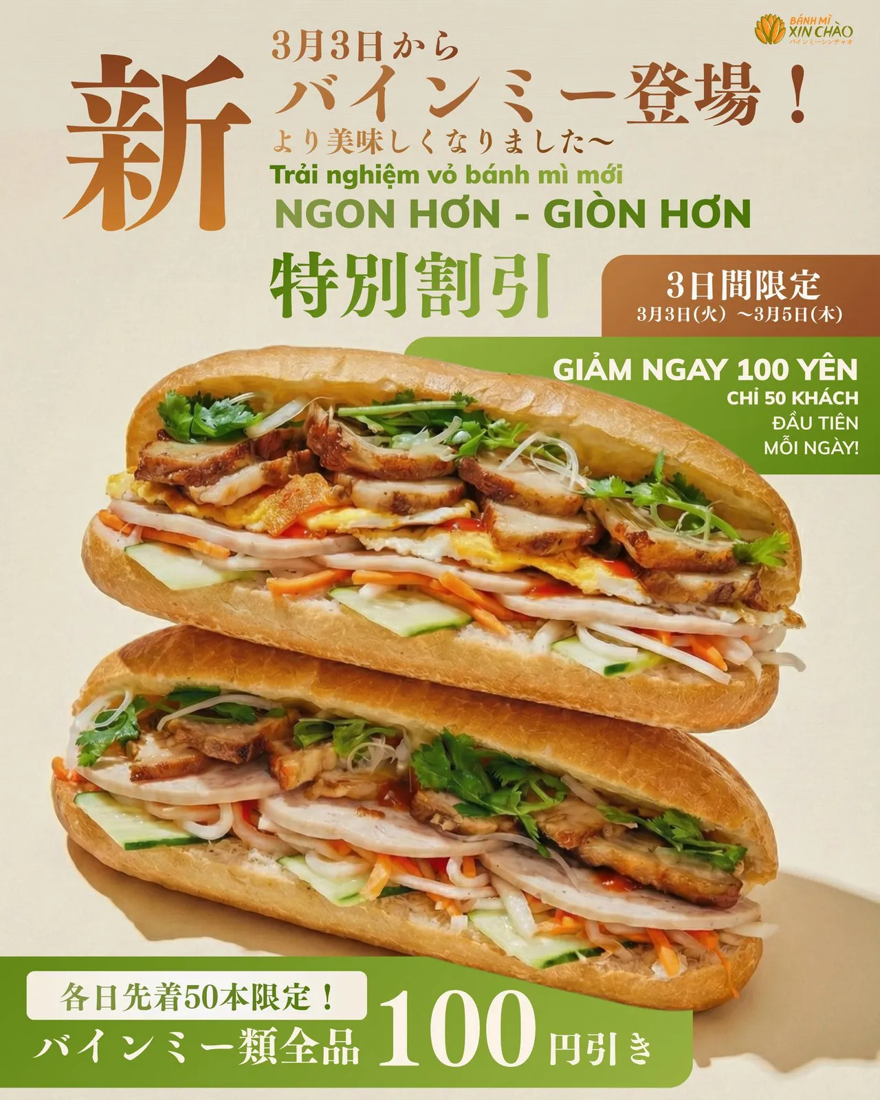 この進化した美味しさを皆様に体験していただくため、超お得な特別キャンペーンを実施いたします!バインミー全品が100円引きとなる特別な3日間です。